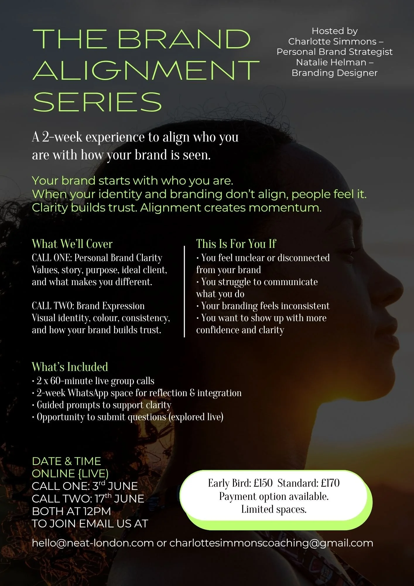 Through two focused live sessions and ongoing support in a private WhatsApp space, you’ll be guided to reconnect with who you are at the core of your work and translate that into a brand that feels authentic, recognisable, and aligned.